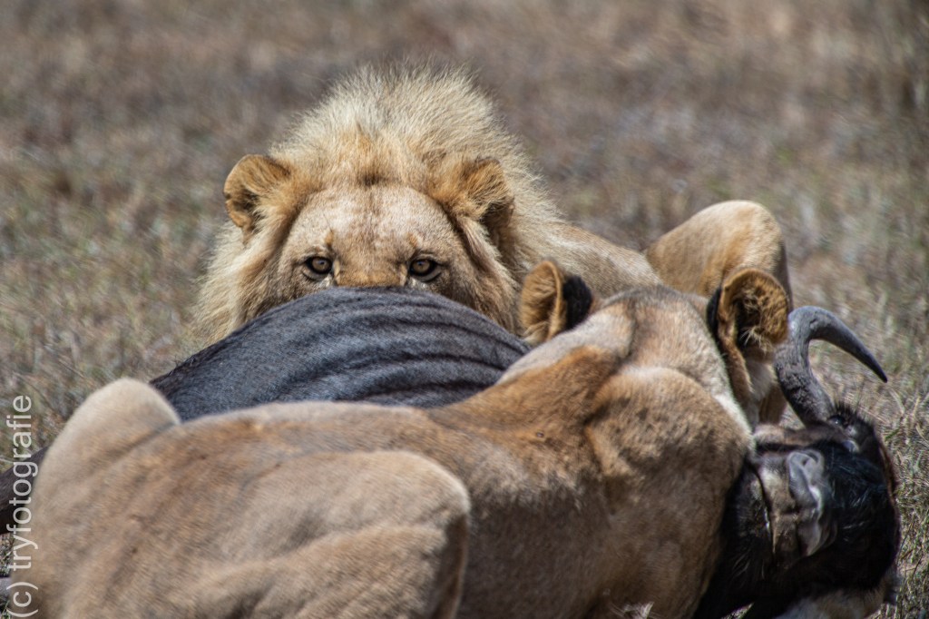 Als bekennender Glückspilz hatte ich das unglaubliche Erlebnis, eine Löwin dabei zu beobachten, wie sie ein weibliches Gnu schlug. Vom ersten Tumult bis zum Zeitpunkt des Ablebens des Gnus vergingen etwa 6 Minuten. Interessant dabei, wie unblutig dieses Drama im Grunde genommen war.